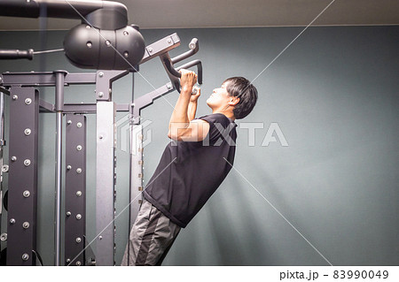 スポーツジムのチンニングマシンで懸垂をする若いアジア人男性