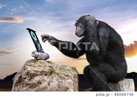 知能の高いチンパンジーが岩に座り電子パネルの操作を頭を抱えながら操作する
