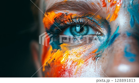 Close up portrait of person with colorful paint on cheeks and forehead in soft light