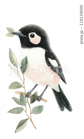 Cute Magpie Bird Holding a Leaf in the Beak, Serene Nature Illustration Generative AI