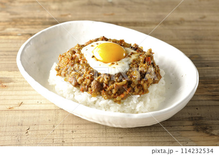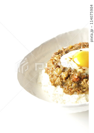 卵黄、焦がしチーズ乗せキーマカレーを白背景で撮影