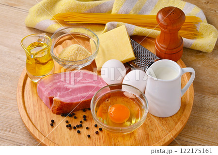 カルボナーラ(イタリアンパスタ)料理を作る食材、卵やベーコン、オリーブオイルとチーズと牛乳。