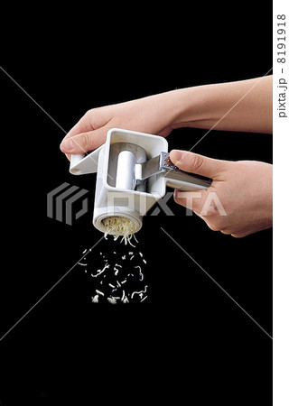 グリュイエールチーズをグレーターで粉状にすりおろす女性の手
