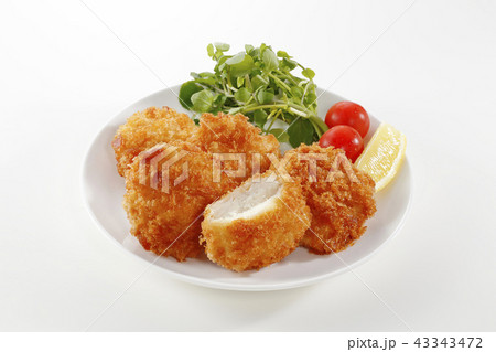 フライパンで調理中の豚ヒレ肉のチーズ入りパン粉焼き【白背景・切り抜き】