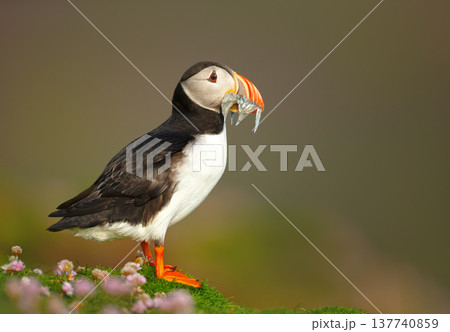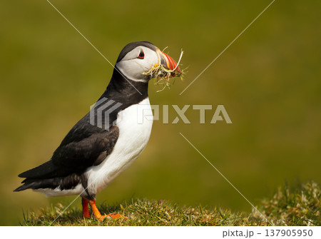 Atlantic Puffin with nesting material in meadow
