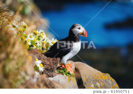 Close up of puffin bird or Fratercula in Iceland in summer season on cliff sea beach background. Animal.