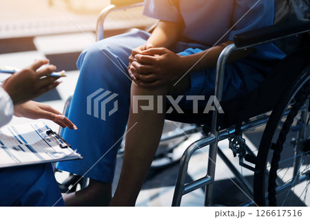 Elderly Woman having Shoulder and Neck and consulting doctor in hospital. Muscle painful due to Myofascial pain syndrome and Fibromyalgia, rheumatism, Scapular pain, Cervical Spine. ergonomic concept