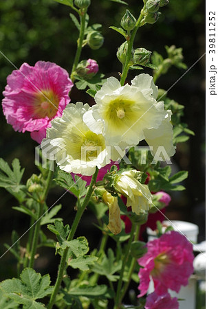 初夏の日差しの下花開く立葵の花