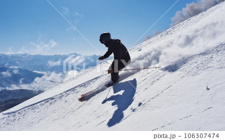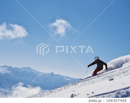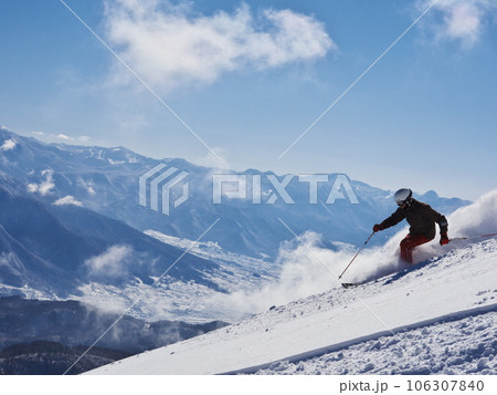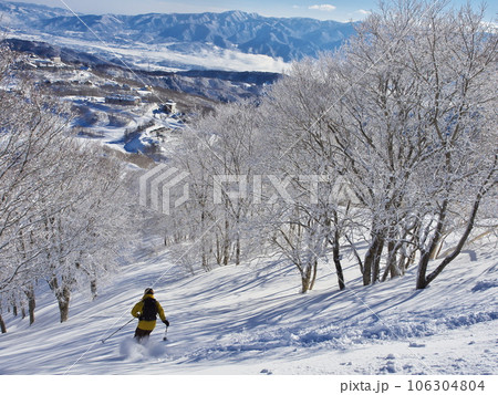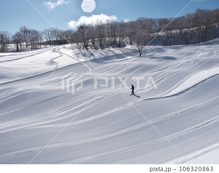 冬の斑尾高原スキー場 未圧雪の上部ジャイアントコースを滑るスキーヤー