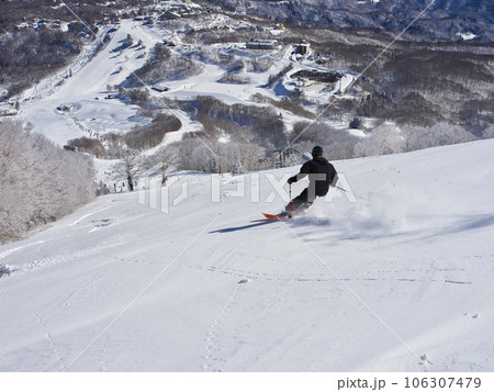 冬の斑尾高原スキー場 ジャイアントコースを滑るスノーボーダー