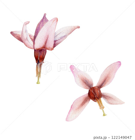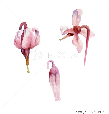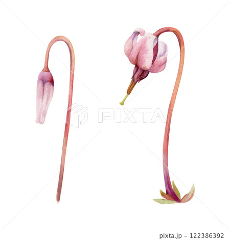 Cranberry pink lily flower bud on stalk stem, swamp wildflower inflorescence. Botanical illustration hand drawn in watercolor. Isolated single elements. Scrapbooking, wedding, florist shop, decoupage