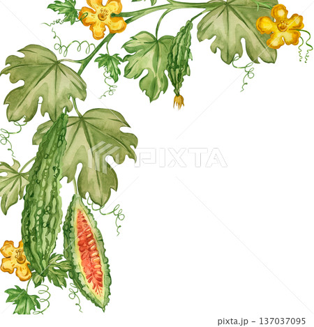 A watercolor frame featuring a bitter melon vine, leaves, and flowers. All elements are hand-painted in watercolor. Momordica, an Indian cucumber, is featured in a healthy eating design.