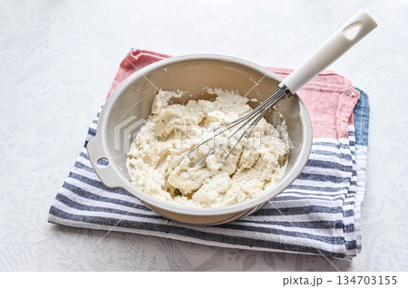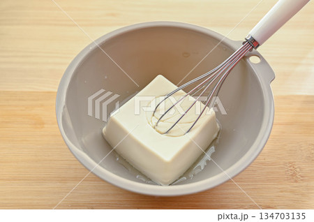 ボウルに入れた絹ごし充填豆腐と泡だて器