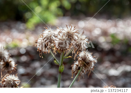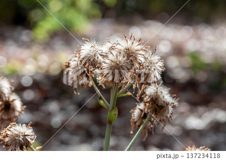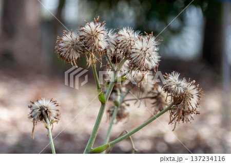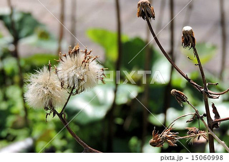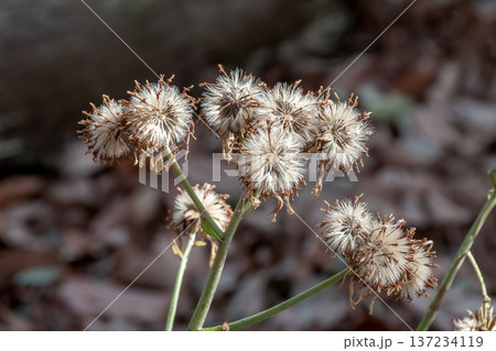 冬に枯れたツワブキの花の後の冠毛と種子