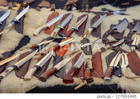 Knives collection Collection of handcrafted knives with leather sheaths displayed on fur-covered table. Concept of craftsmanship, survival tools, rustic design