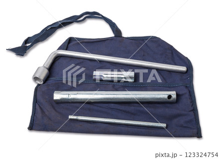 Wheel wrench and transportation hook on a blue cover for car repair on the road in the absence of insurance on a white isolated background.