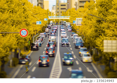 ミニチュア風・黄色に色づいた銀杏並木の明治通り【秋イメージ】