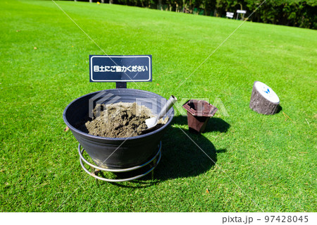 青空のゴルフ場・ティーグラウンドにある砂バケツとスコップ、ティ・ボーリングのセット(千葉県木更津市)