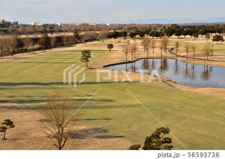 青空のゴルフ場・池やがある丘からの打ち下ろしで難しいコースの眺め(千葉県木更津市)
