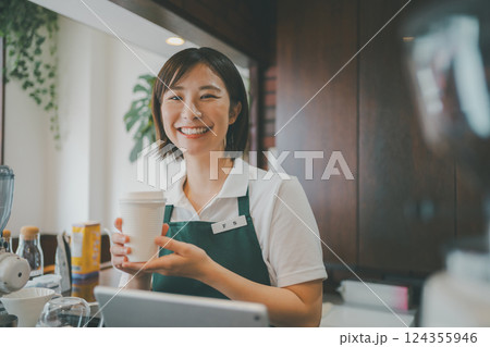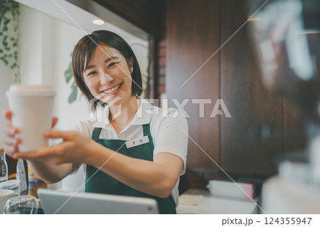 休憩時間にコーヒーをテイクアウトする笑顔の20代OL