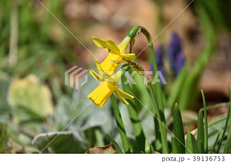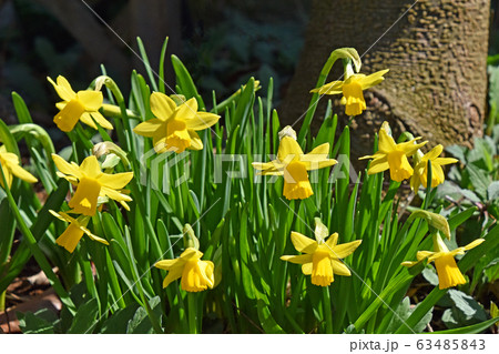 早春の庭に咲く黄色いミニスイセン(テターテート)の花