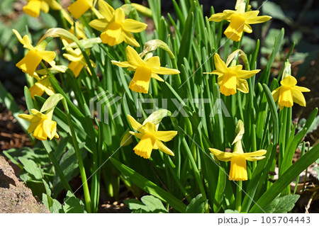 早春の庭に咲く黄色いミニスイセン(テターテート)の黄色い花
