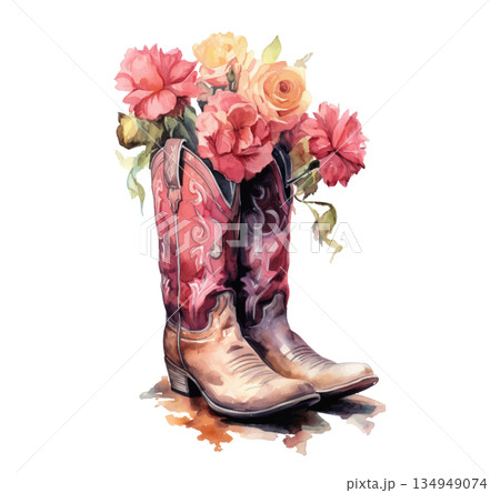 白背景に隔離されたカウボーイブーツとバラの花の水彩画イラスト、カントリースタイルの装飾素材