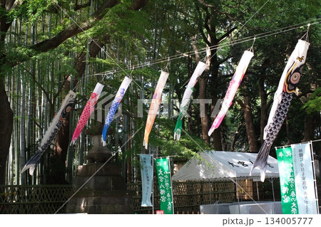 爽やかな新緑の杜に映える、色鮮やかな鯉のぼりの群れ