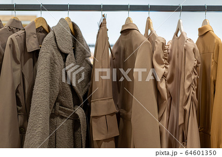 Clothes hang on a shelf in clothes store. Clothes for women hanging on hangers in home closet or shopping mall for store sale concept.