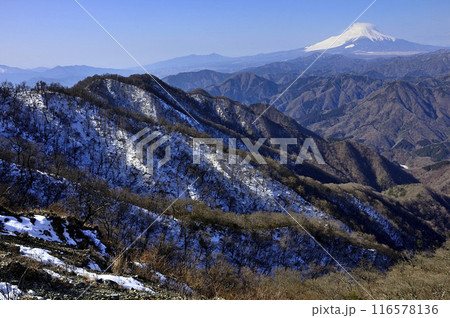 丹沢山地の檜洞丸から望む厳冬の富士山と雪の西丹沢