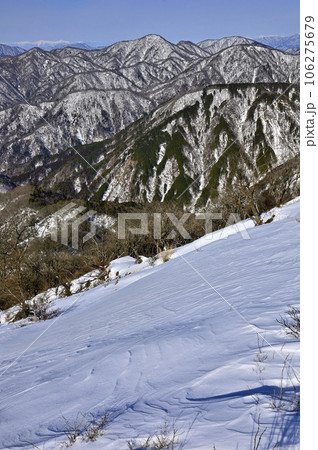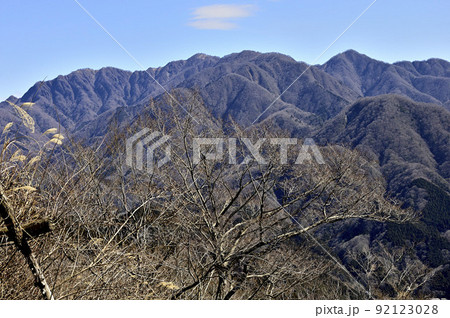丹沢の世附権現山からの展望 崩落した山肌に丹沢主稜と石棚山稜