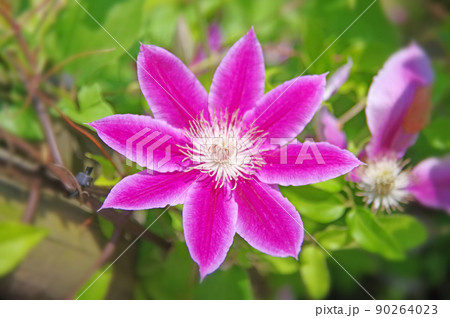 赤紫色の大輪の花が咲いたつる性植物のクレマチス