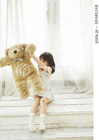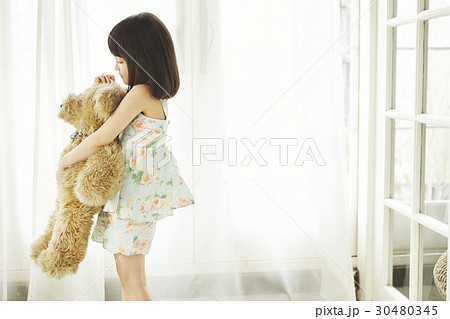 小さなクマを持ち窓際に立つ女の子