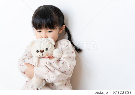 お気に入りの熊のぬいぐるみを抱っこする子供(育児・子育て・プレゼント・5歳)