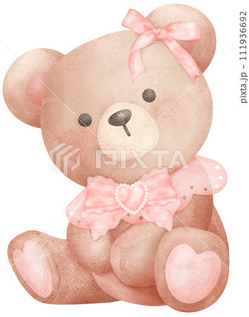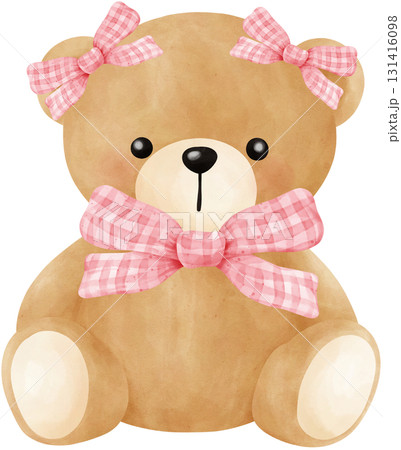 Cute teddy bear with pink bow watercolor illustration