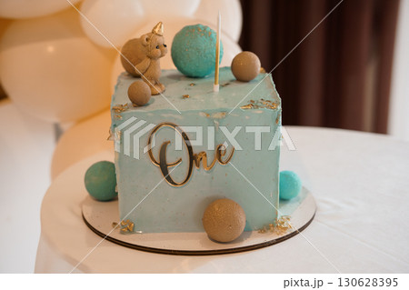 First Birthday Celebration Cake with Unicorn Theme: Blue Square Cake with One Topper, Teddy Bear, and Macarons