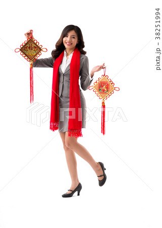 Asian Woman decorated house for Chinese New Year Celebrations. putting traditional pendant to the Chinese Lunar New Year for good luck. Chinese word means blessing