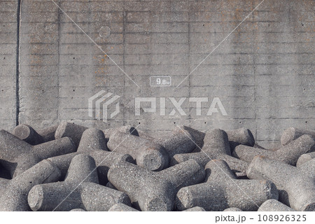 海の護岸に積み上げられた消波ブロックテトラポッド