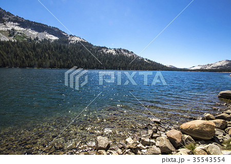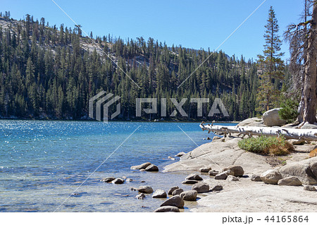アメリカ カリフォルニア シエラネバダ山脈ヨセミテ国立公園の岩山と湖