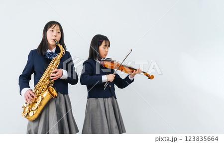 サックスとバイオリンを練習する女子学生グループ