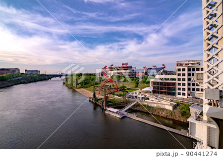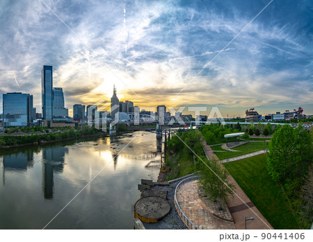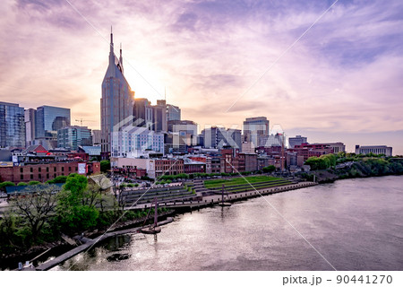 Nashville tennessee city skyline at sunset on the waterfrom