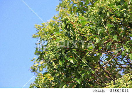 白いつぼみと花をつけたネズミモチの樹(新緑のタマツバキの枝々)