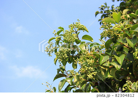 青空と木漏れ日を浴びたネズミモチの枝先(タマツバキの白い花とつぼみのクローズアップ)
