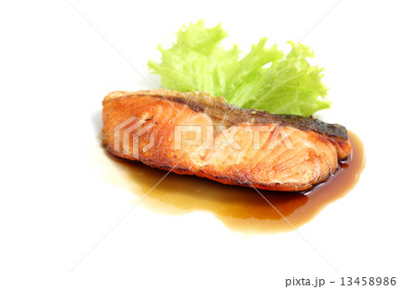 grilled salmon with teriyaki sauce isolated in white background