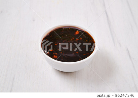 Small bowl with spicy teriyaki sauce.