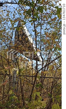 A large satellite dish antenna is partially hidden by vibrant autumn trees. This scene showcases the blend of telecommunications technology with the beauty of nature in a rural setting.