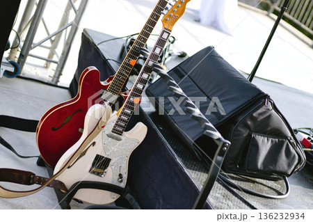 A couple of electric guitars leaning against a stand next to a live performance stage