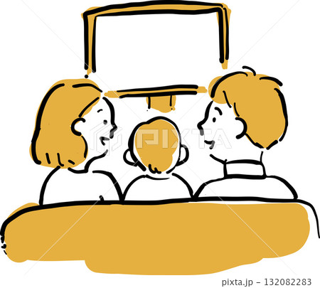 テレビ、モニターを見る家族、線画