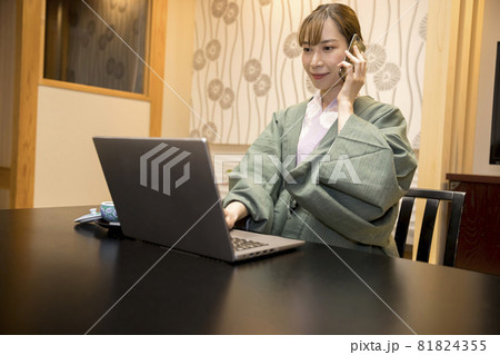 温泉旅館で仕事をする浴衣姿の若い女性