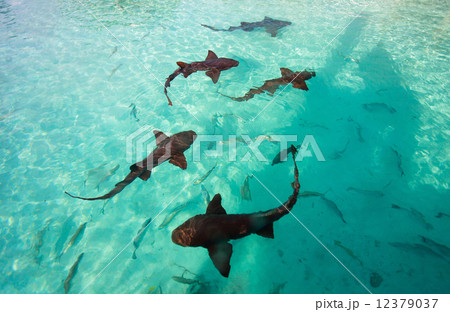 水族館の水槽で悠然と泳ぐサメの写真素材